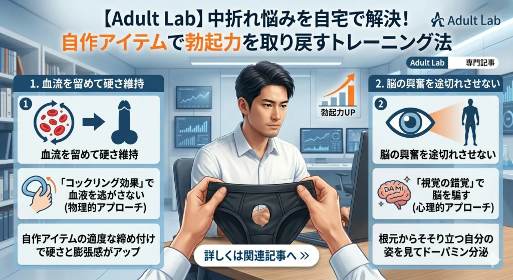 ソロタイム中の「中折れ(途中で萎える)」は、血流の低下(物理的原因)と、脳のマンネリ(心理的原因)の2つが重なって起こります。 この記事では、自作の「穴あきパンティ」を活用し、根元の締め付けによるコックリング効果(血流キープ)と、AV男優のような逞しい見栄え(視覚的興奮)のダブルアプローチで、最後まで力強い勃起を維持する裏技を公開しています。